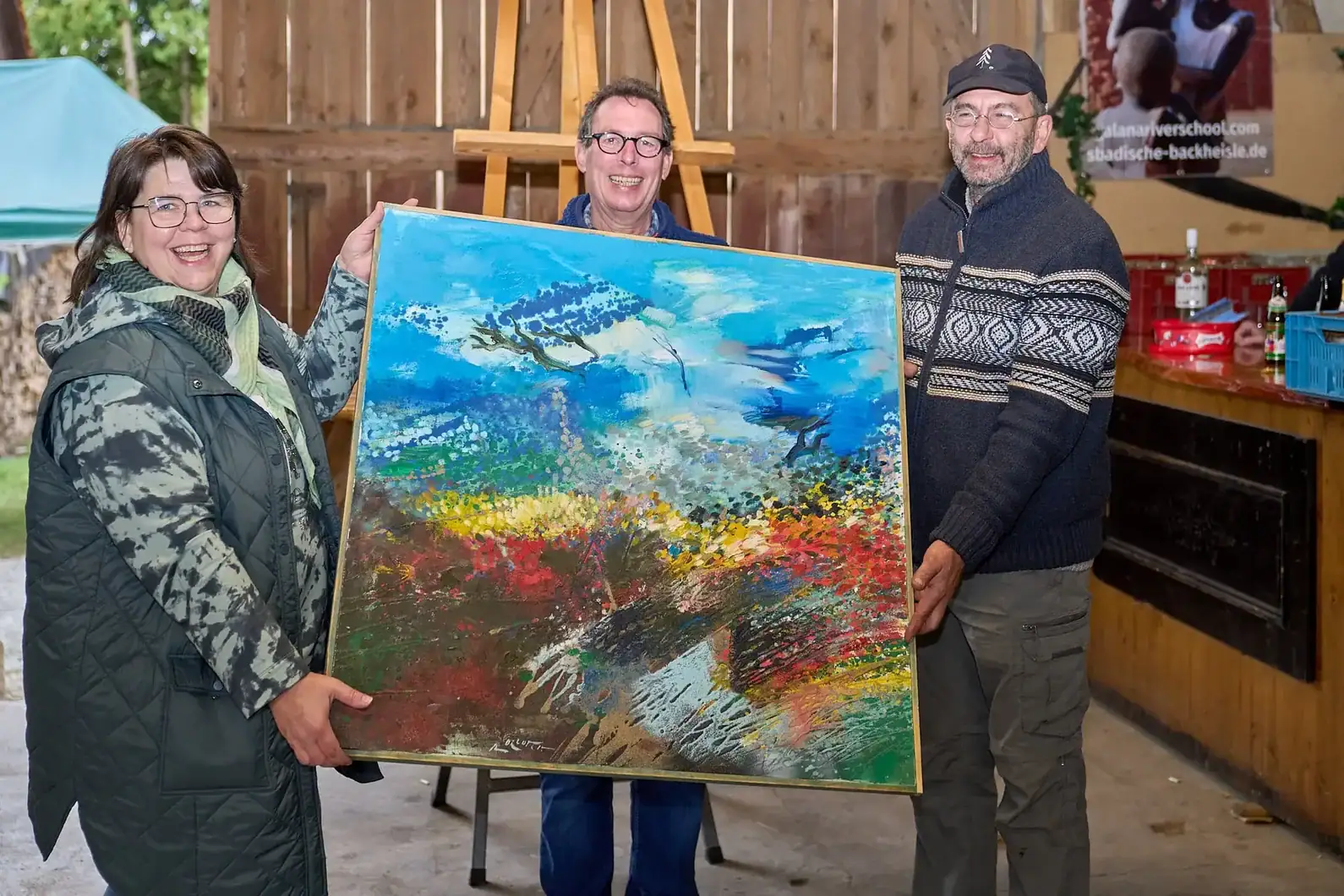 Markus Dietz, S’badische Backheisle und Vorstand Galana River School Project e.V.; Siegmut Reichert, Galerie Reichert Kupferzell; Gewinnerin Anja Leitlein; Simone Weis-Heigold, Artefact Grafik Fotografie Training und eine der beiden Vorstände beim Unternehmer Netzwerk Hohenlohe; Weinprinzessin Carolin Helbig; Gerhard Große, Vorstand Galana River School Project e.V.