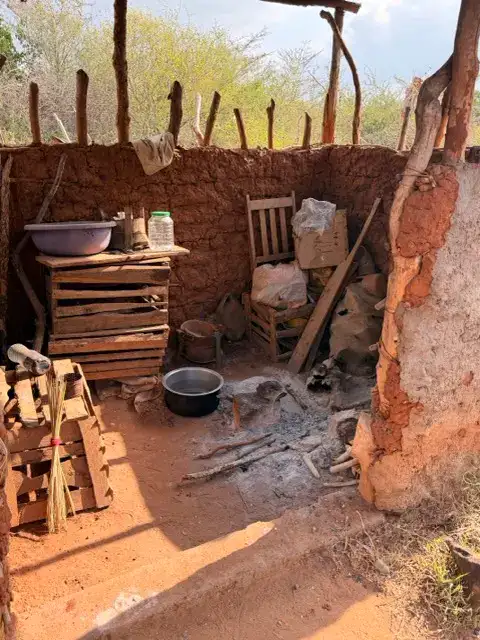 Cuisine commune: une cabane en roseaux à l'extérieur, foyer rudimentaire avec trois pierres